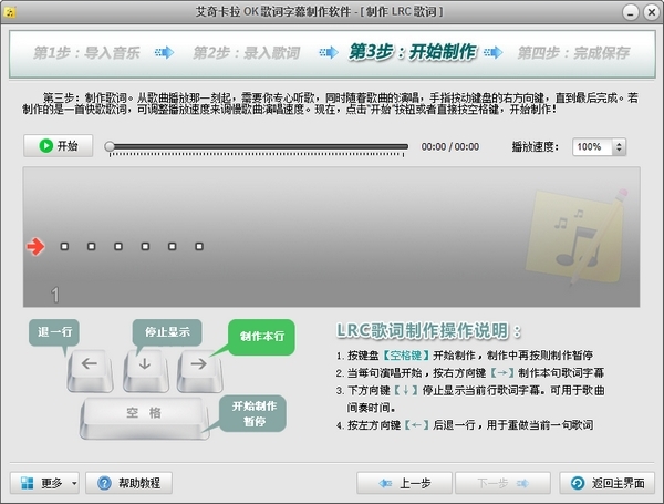 全程引导式界面,清晰直观的操作流程指引。只需4个简单步骤就能轻松完成LRC歌词的制作和编辑。