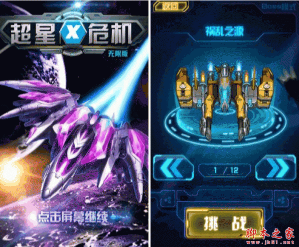3.选择战机和场景关卡进入游戏画面.剧情画面点击跳过来进入;