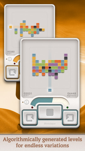 Mosaique《奇异方块》可算是方块游戏里面的另类,小清新风格,玩法与任何"方块前辈"都不同——围绕关卡全方位移动小方块,对准同色的小方块,按中间的正方按钮,啪一声消除。如果撞上异色方块,那就来个位置互换,原先控制的方块丢到关卡里,原先关卡里的方块跳出来让玩家控制。游戏难点在于方块很乱,非一般的乱,各种颜色混杂一起,如果不能连续消除多个同色方块,能量值绝对不够(方正按钮上的橙、灰色槽),所以这时候就要玩家开动脑筋了,多移动方块,多寻找可以批量消除方块的方法。