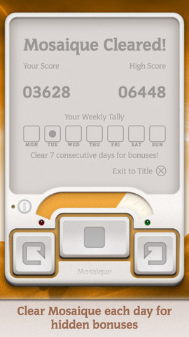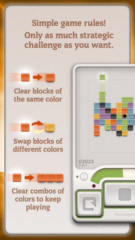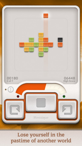 《奇异方块》Winning Blimp制作的休闲益智小游戏Mosaique《奇异方块》风格清新简约,玩法也很新颖奇特,在俄罗斯方块的基础上,玩家还可以将方块放置中间进行同色消除。开发商表示,游戏走小而精路线,意在帮助玩家打发无聊的地铁时间,为此还特地设置了好听的背景音乐。