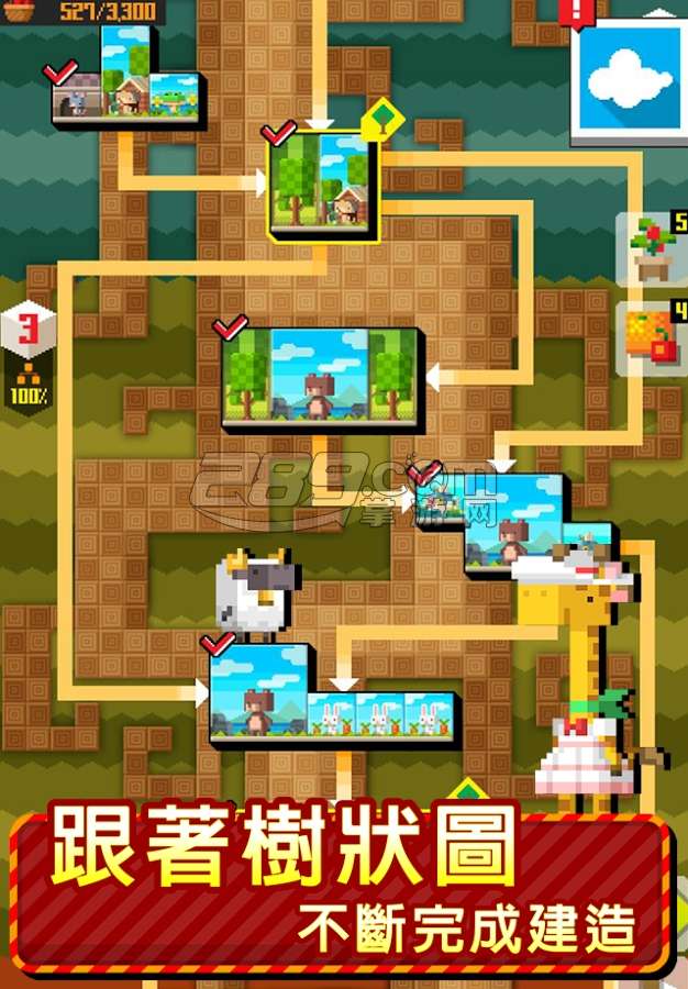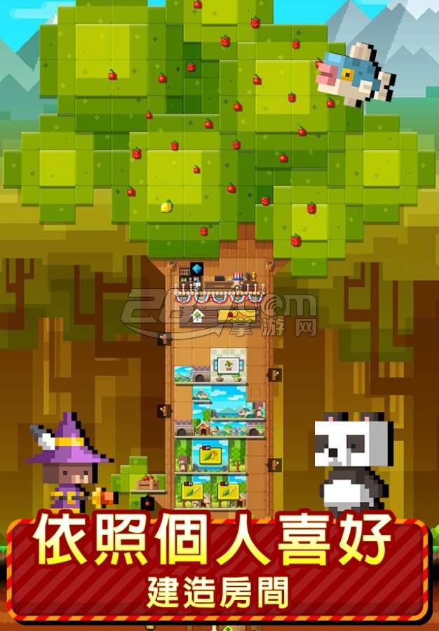 让像素树开枝散叶,一步一步往上建造吧!《动物方层树》最大游戏特色,自由打造自我风格的可爱小窝,共有 198 种造型,无论是梦幻的动物房间「可爱的大熊家」、「青蛙武士培养计画」;满足口腹之欲的餐饮造型房间「糖果水族馆」、「热狗堡」:还是主题造型房间「王室卫队」、「幽深洞穴」,都能自由发挥。另外,完成指定任务还能获得稀有素材来建造新家,想要快速养成大树,秘诀就在按下天空朵朵白云,召唤雷神帮忙灌溉。