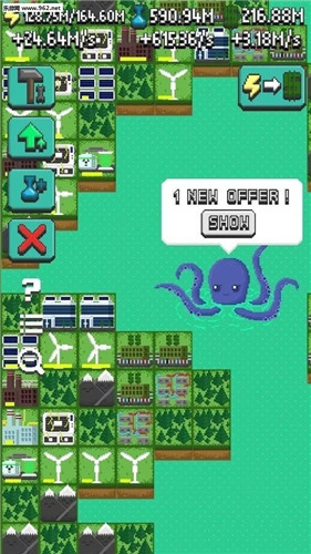 画风相当粗糙的放置类游戏,主要目的是通过建造发电设备取得能源并且赚取金钱。