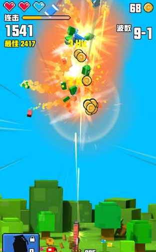 1、射击,用枪来击碎飞出的物品!打碎它们,获取分数与金币,不要让它们落到地上;